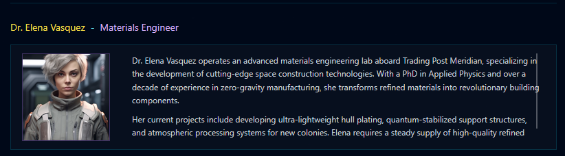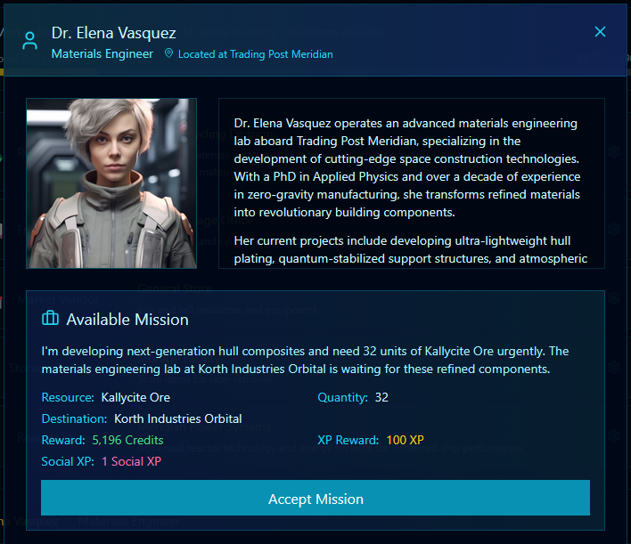 As we are reviewing the Materials Engineer NPC, let’s travel to Trading Post Meridian and go visit Dr. Elena Vasquez. Try using the Navigation Console and clicking on the ‘Trading Post Meridian’ name. Your autopilot will take you directly there (if you’re in Feris).