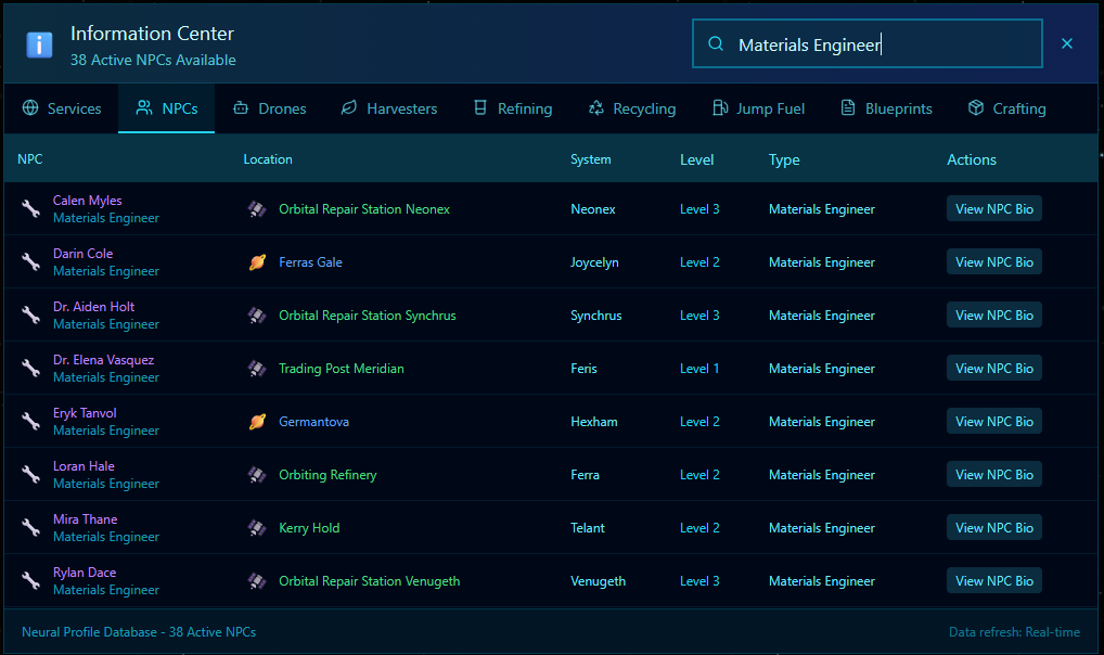 Forges space currently has Five Types of NPC. NPC stands for non-player character. Lets look at the ‘Materials Engineer’. Below, I have opened the Information Centre and gone to the NPC’s tab. You can see the Spanner Icon next to these NPC’s and the Type set as Materials Engineer.