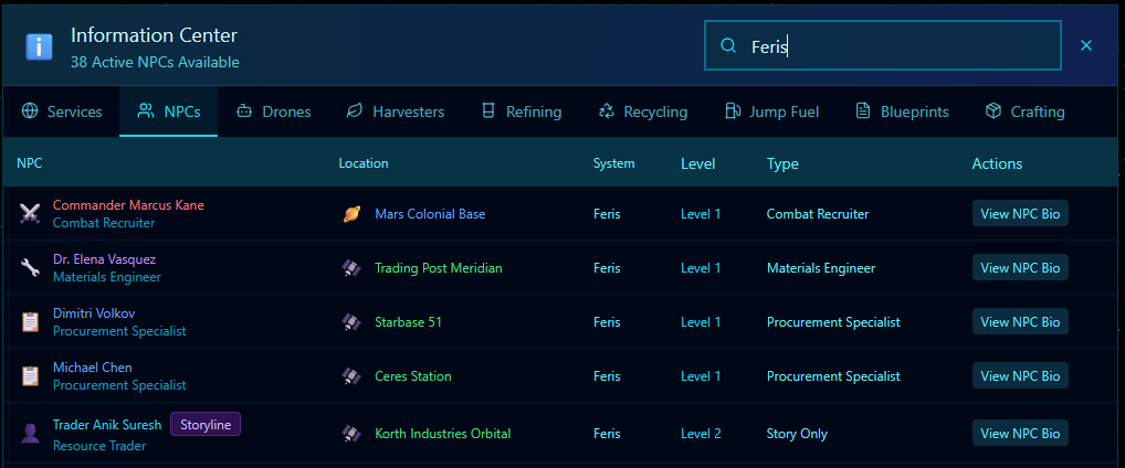 You can use the search bar to filter by type, name, location, or even system. The latter is a great way when entering a system to check what NPCs are available. Below, I have filtered the view for Feris.