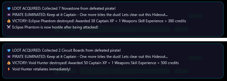 As you can see from above, we gained 7 Novastone and 2 Circuit Boards for those two kills, plus of course, Level XP and 1 Weapon skill for each kill. Plus, finally, credits.